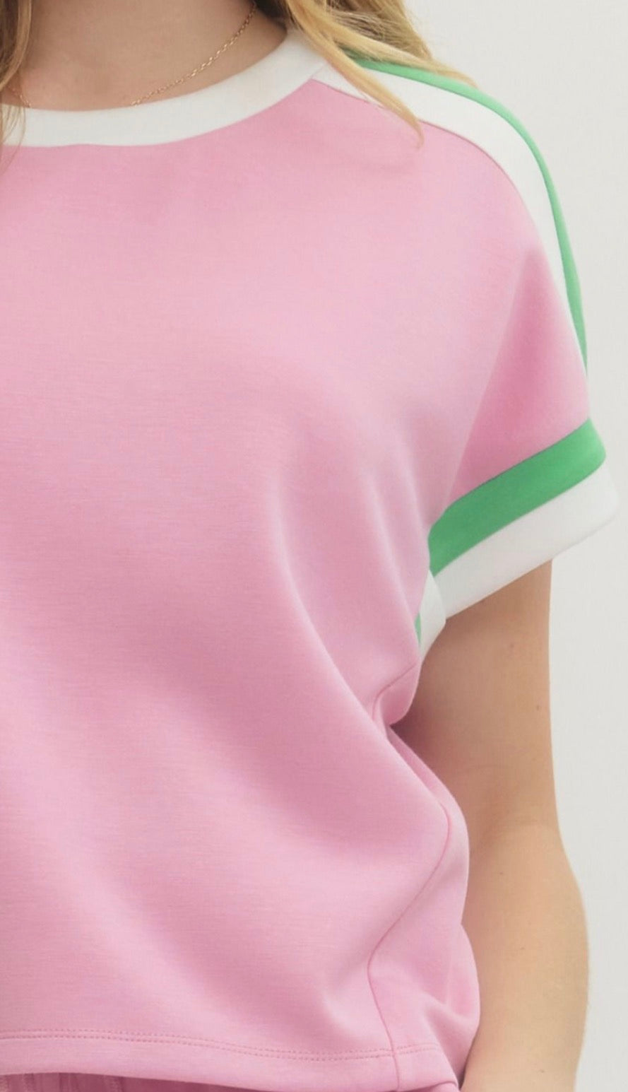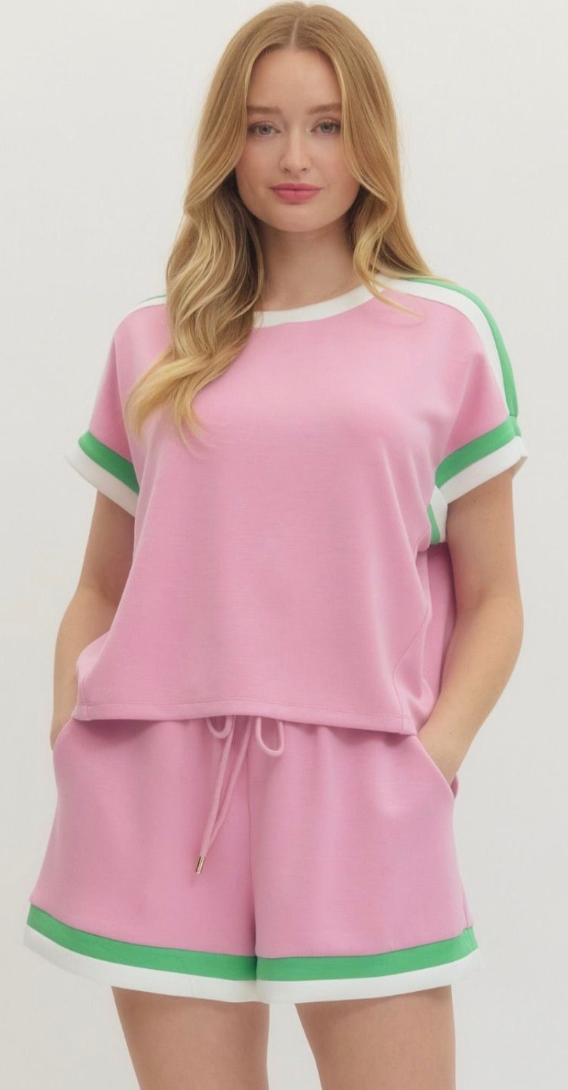 Solid short sleeve knit top and bottom featuring contrast trim at neckline, sleeves and shoulders. Unlined. Knit. Non-sheer. Lightweight.